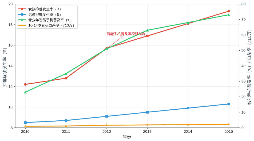 数据显示,在2010-2015年之间,全球青少年心理健康发生断崖式下跌。焦虑症、抑郁症及自杀率,在经历了多年平稳后,突然陡峭上升,这一趋势在青春期女孩中尤为显著。这一时间窗口,与智能手机的普及、前置摄像头的广泛应用,以及社交媒体兴起高度重合。