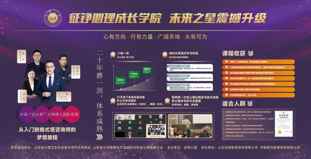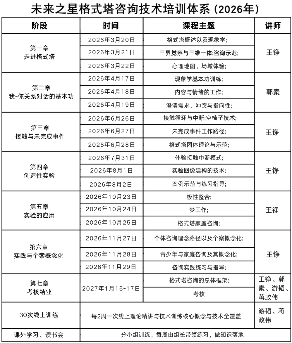 由中国“皮尔斯”王铮博士领衔的核心导师团带队,深耕格式塔疗法二十多年,沉淀出成熟的培养体系,从入门到成为专业格式塔咨询师,全程跟着行业权威走,专业度直接拉满。